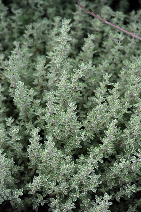 THYMUS citriodorus Silver Queen Це ґрунтопокривна багаторічна рослина з ароматним, тонким, темно-зеленим листям і невеликими фіолетовими квітами. Виростає до 30 см у висоту і розростається до 40 см в діаметрі. Рослина родом з Європи та Марокко.