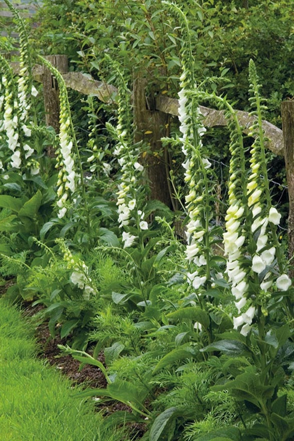 НАПЕРСТЯНКА пурпурна Alba. Численні потужні стріли пагонів заввишки до 1.2 м у нижній частині густо облиственні. Листя лінійне довжиною до 30 см, гладке або злегка опушене. Щільні циліндричні кисті досить великі, незвичайної форми квіток, білого кольору які займають дві третини квітконосів.Розростаючись, дуже незвично і велично виглядає на задньому плані міксбордера, є прикрасою будь-якого саду.