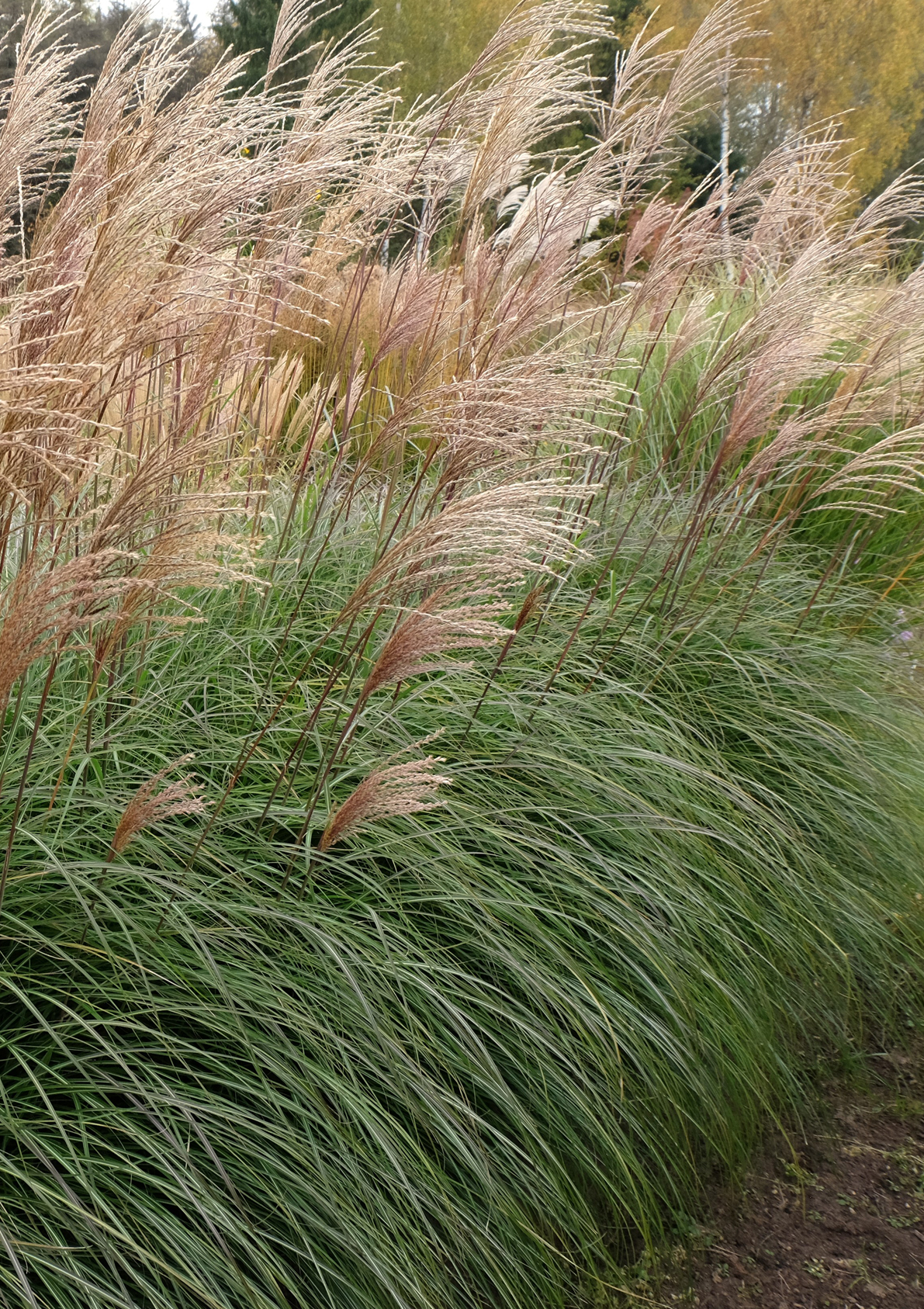 Міскантус китайський (Miscanthus sinensis) – дуже приваблива, сильноросла трава, що утворює великі купини, висота яких залежить від сорту (1,0-2,5 м). Купини мають листя завдовжки 40-60 см, більш-менш поникле, яке може бути вузьким або широким (до 3 см), зеленим, зелено-сірим, поздовжньо смугастим з білим (наприклад, 'Cabaret', 'Variegatus'), поперечно смугастим з жовтим (наприклад, 'Zebrinus', 'Zebrinus Strictus'), зеленим з білою центральною жилкою (наприклад, 'Kleine Fontane', 'Silberfeder') або з білими краями (наприклад, 'Morning Light', 'Cosmopolitan'). Восени листя деяких сортів жовтіє (наприклад, 'Silberspinne'), жовто-помаранчеве (наприклад, 'Adagio', 'Flamingo'), оранжево-червоне (наприклад, 'Ghana'), червонувате (наприклад, 'Ferner Osten', 'Kleine Silberspinne'). Окрасою рослини є ефектні, пір'ясті суцвіття, які ростуть зі стебел з серпня по жовтень і мають сріблясто-білий або червоно-рожевий колір (наприклад, 'Rotsilber', 'Ferner Osten', 'Flamingo'). У деяких сортів рожеві суцвіття восени стають сріблястими. Зрізані суцвіття підходять для сухих букетів, а залишені на рослинах, вони прикрашають сад до пізньої весни наступного року.