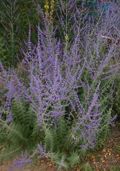 Perowskia lobodolica – це ароматний напівчагарник з цікавим листям і квітами. У нашому кліматі щорічно взимку відмирає надземна частина. У культурі є кілька сортів, що відрізняються висотою рослин (50-120 см), забарвленням квіток (лавандові, темно-сині, лілово-блакитні), довжиною суцвіть (30-50 см). Листя всіх сортів при подрібненні ароматні. Вони досягають довжини близько 5 см, злегка виїмчасті і, як і пагони, густо, сріблясто опушені. Дрібні квітки, зібрані у великі пухкі волоті, з’являються з липня по вересень, іноді до жовтня. Рослина вимагає повного сонячного світла і водопроникного, сухого або помірно вологого ґрунту. Він повинен рости в місцях, захищених від зимових вітрів, і додатково повинен бути замульчований корою на кілька сантиметрів, щоб захистити коріння від морозу. Навесні рекомендується низько обрізати пагони на висоту 5-7 см. Придатний для посадки на клумбах, приваблива медоносна рослина. Приваблює бджіл, джмелів і метеликів.
