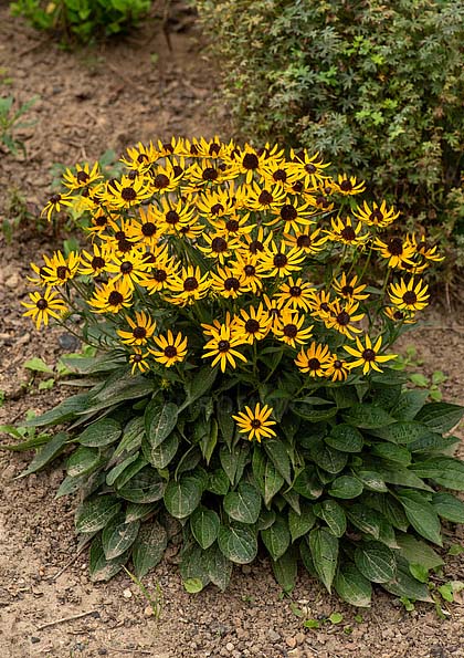 Рудбекія блискуча - це багаторічник з сильно розгалуженими стеблами, блискучими, крупнозубчастими листками, що досягають у висоту 40 - 90 см залежно від виду або сорту. Квіткові кошики діаметром 12 см складаються з жовтих язичкових квіток і коричнево-чорних трубчастих квіток. Рудбекія - один з основних багаторічних рослин для великих клумб. Він невибагливий, характеризується тривалим цвітінням, з липня по жовтень. Це медоносна рослина, а також приваблива для метеликів. Рекомендується для будь-якої багаторічної клумби, де достатньо сонця і середня за вологістю грунт. Він також добре почувається в сухих місцях. Найкраще виглядає при посадці групами (по 10-20 штук разом). Його можна використовувати для натуралістичних посадок, на квіткових галявинах або в контейнерах. Квіти придатні для зрізання і довго залишаються свіжими у вазі.