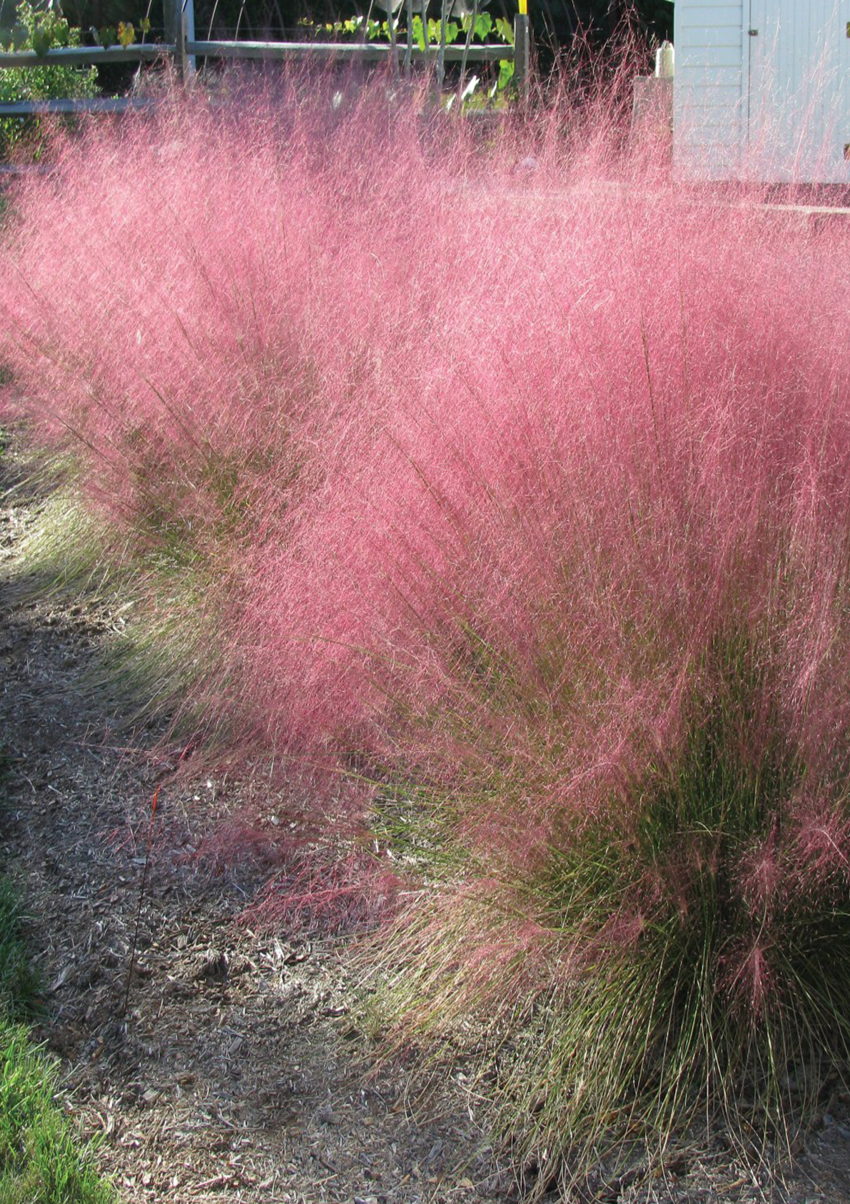 Густокущова трава, під час цвітіння досягає приблизно 90 см у висоту. Цвітіння починається у вересні, утворюючи численні волоті довжиною від 30 до 40 см і шириною від 8 до 15 см, розкидані, червонуваті та з виступаючими гілками. У повному цвітінні вона має дуже характерний вигляд, ніби оповита рожевим туманом. Ця рослина чудово підходить для вирощування в контейнерах. Їй потрібне сонячне, сухе місце та добре дренований ґрунт